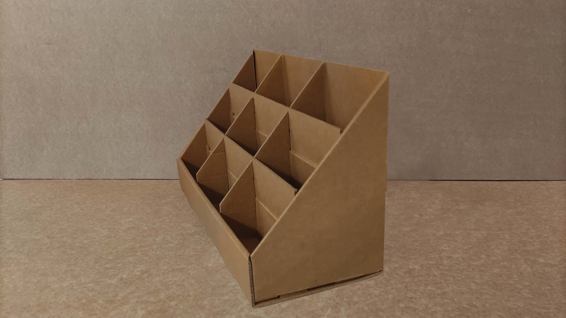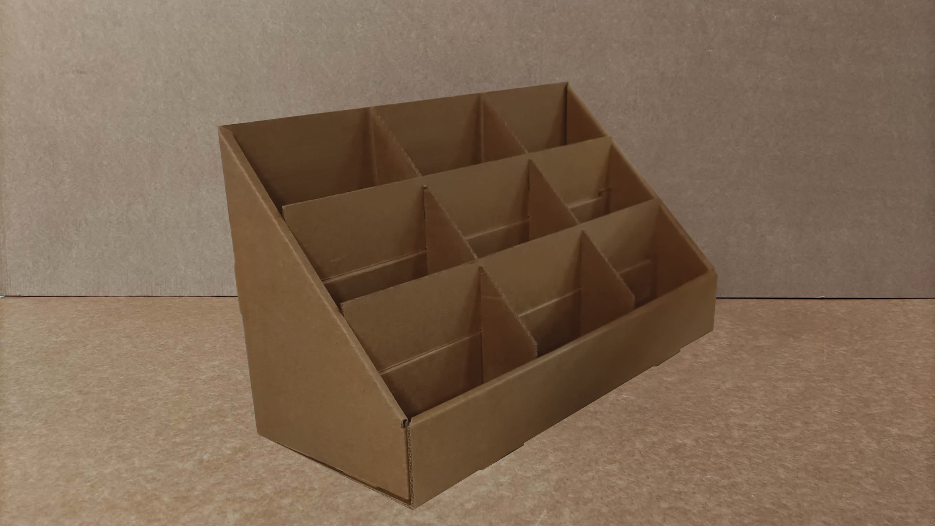 Expositor de sobremesa fabricado en cartón ondulado doble microcanal acabado kraft - 3 mm de grosor. Lleva 9 separaciones en tres alturas diferentes para exponer folletos, postales... Se le puede incluir una cartela.