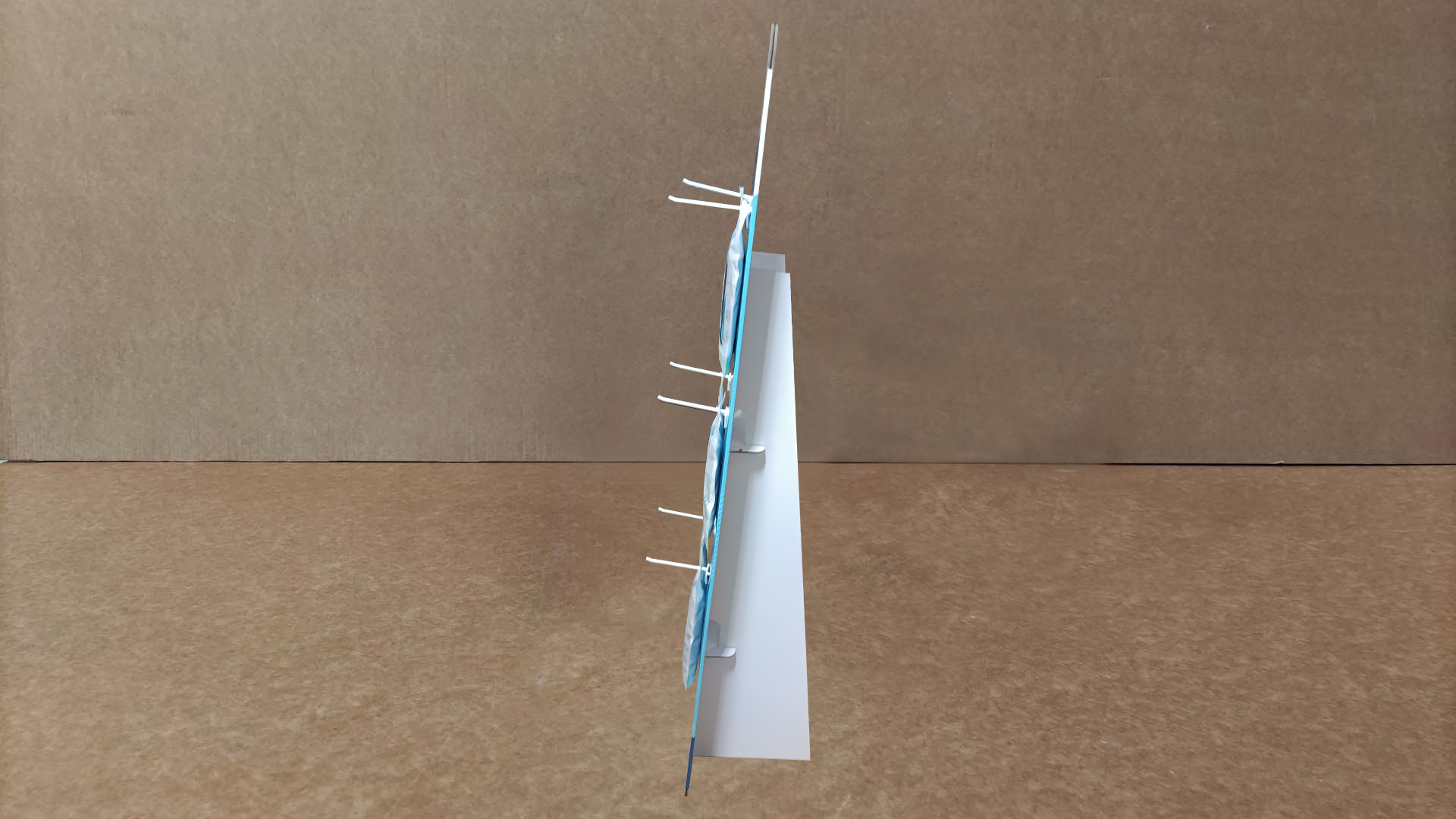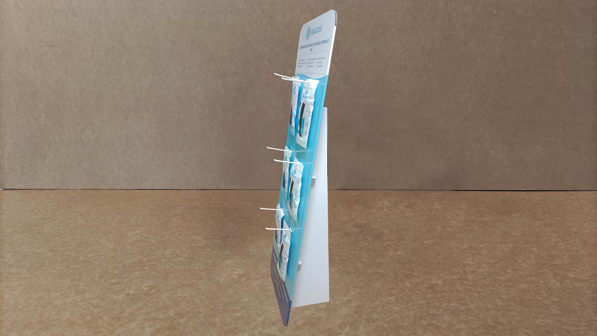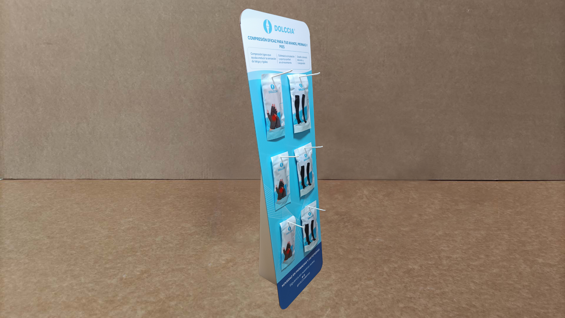 Expositor de pie fabricado en cartón doble micro de 3mm de grosor. Expositor con peana y ganchos para colgar su producto.