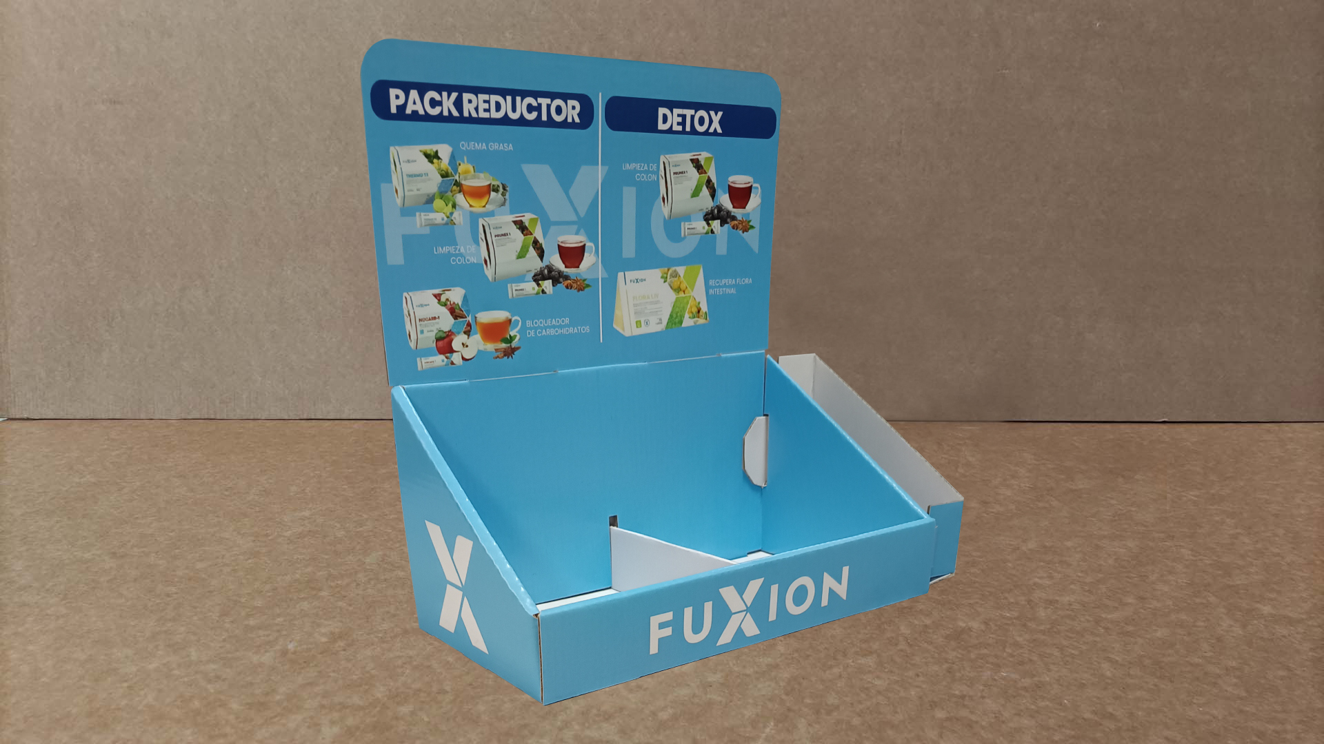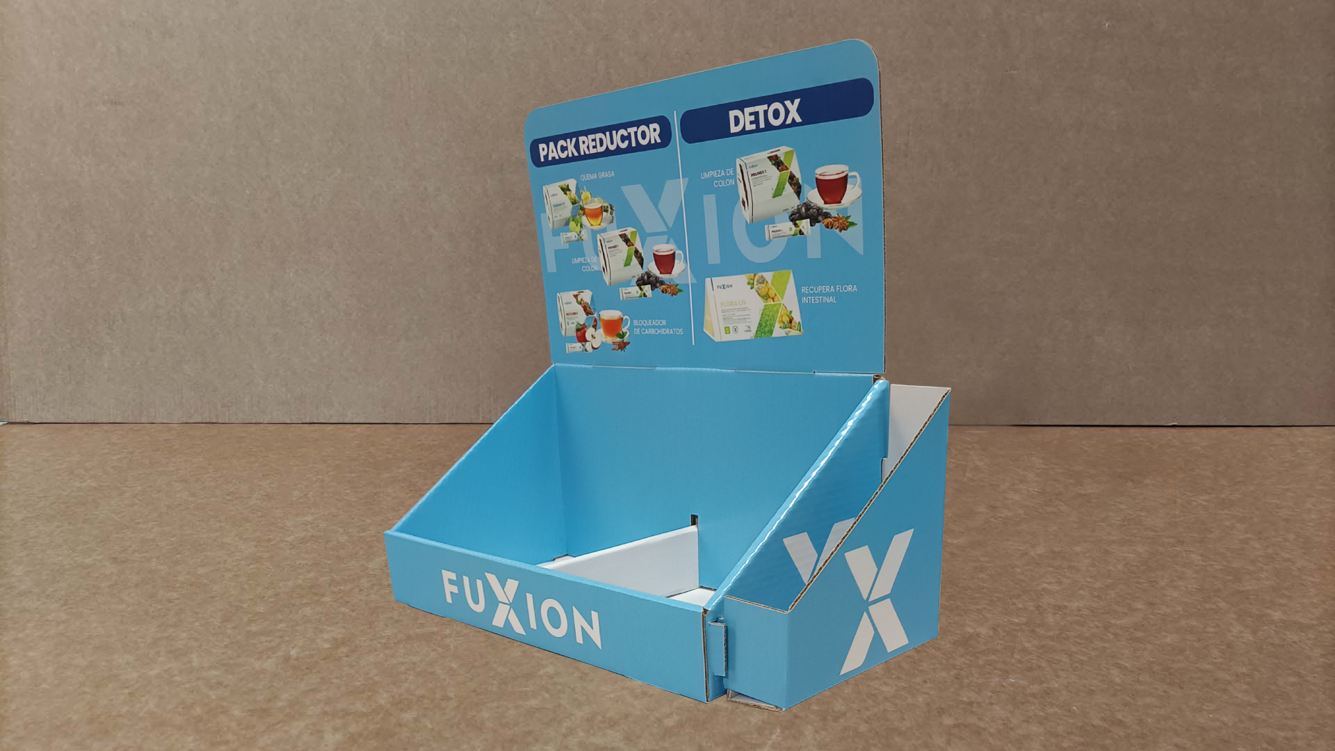 Expositor impreso con tintas HPLatex 100% ecológicas y personalizado.