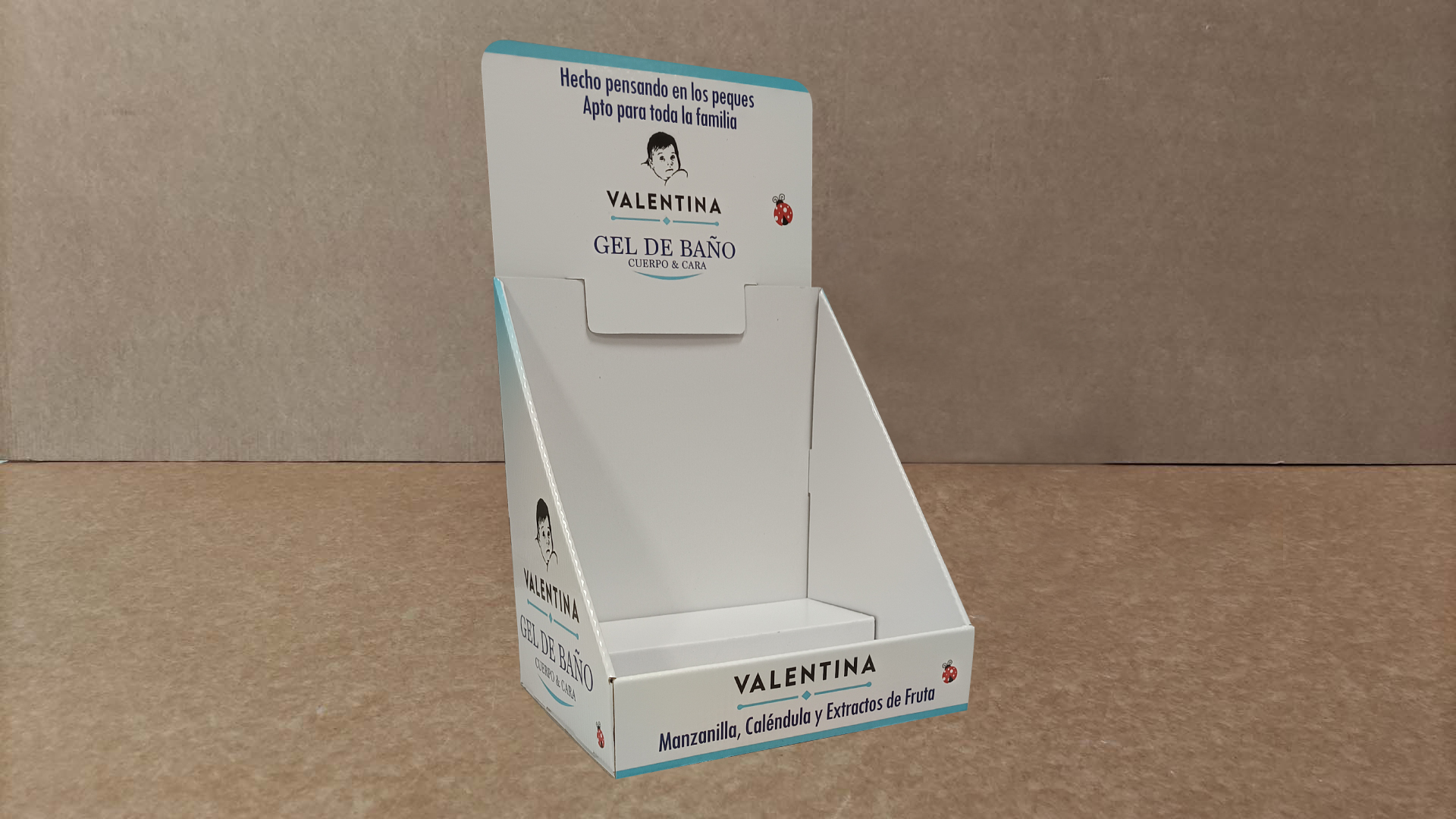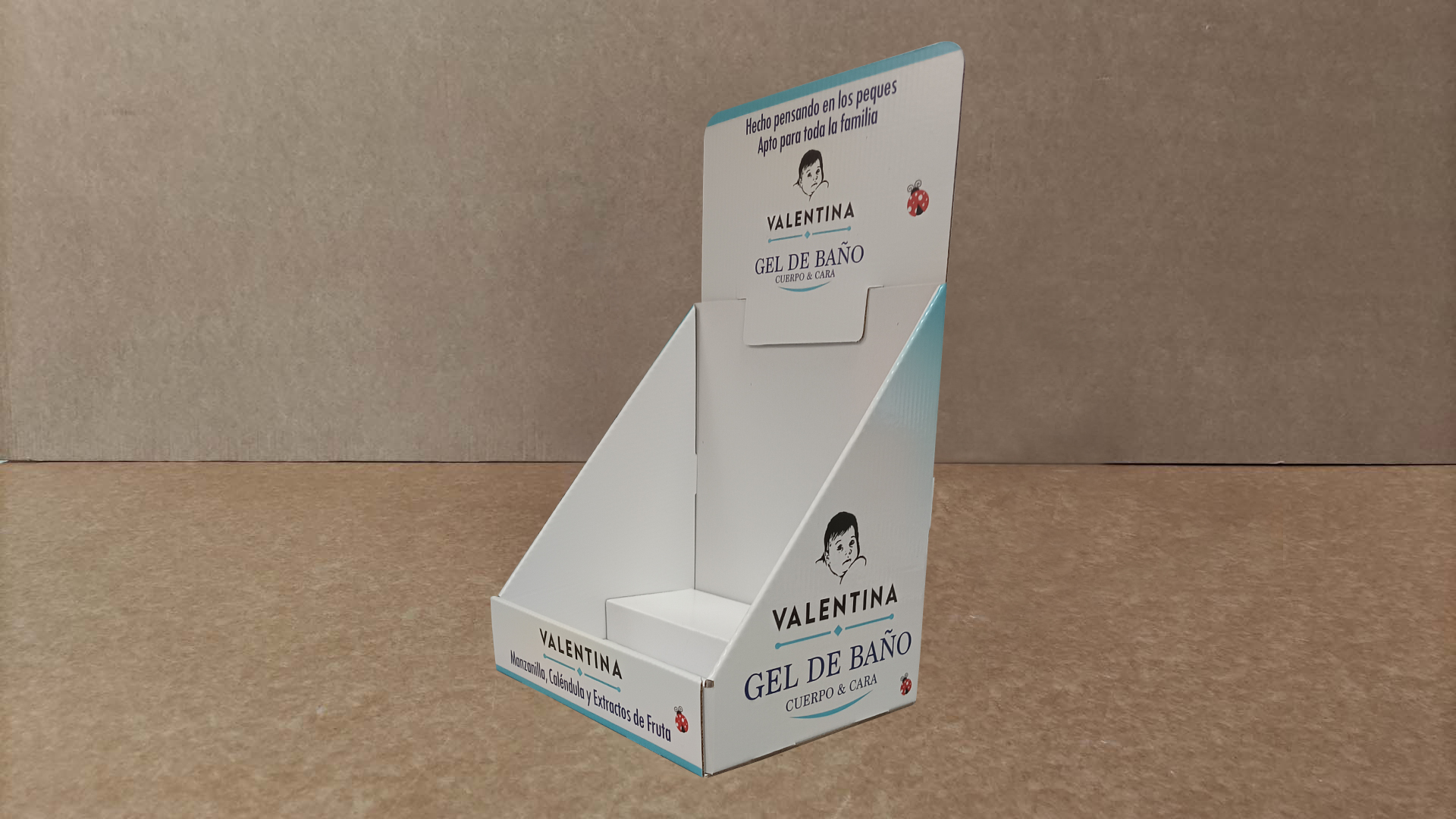 Expositor de sobremesa personalizado fabricado en cartón microcanal estucado (grosor 1,5mm). Lleva un escalón de 3 cm de altura.