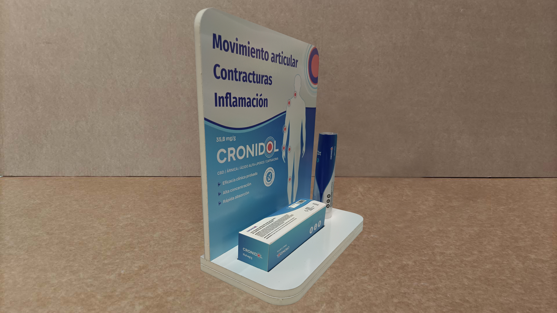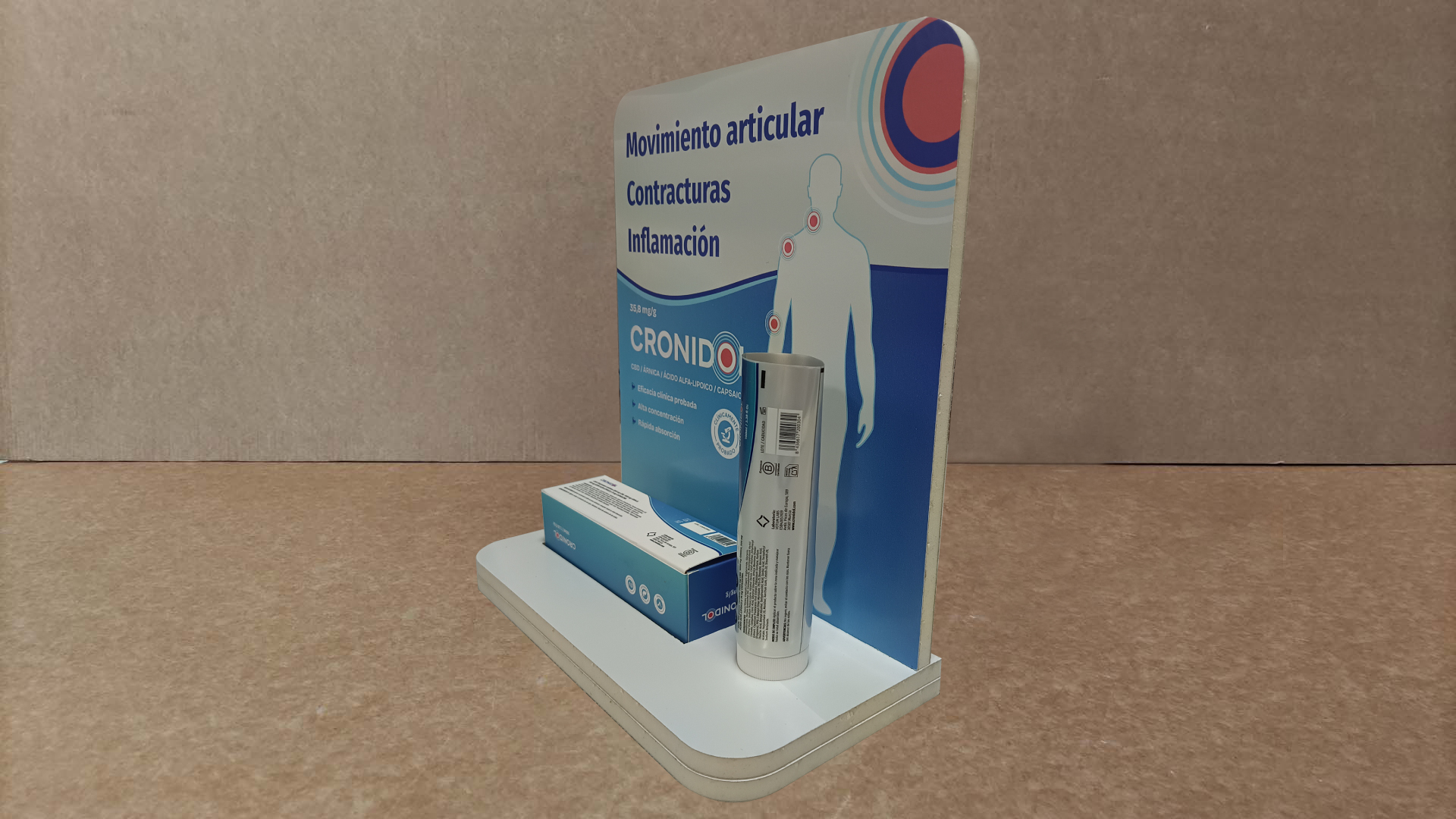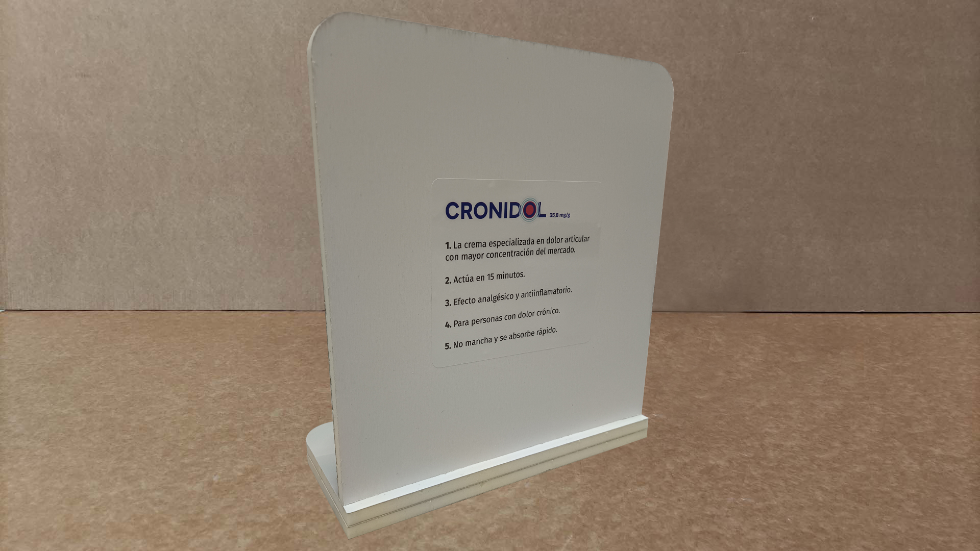 Expositor de sobremesa de dos alturas con troqueles para colocar el producto a exponer fabricado en foam. La primera altura sirve de pedestal y la segunda es la que tiene el troquel para encajar el producto. En la parte trasera de la cartela lleva una etiqueta con información relevante.
